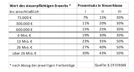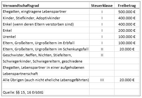 Für die Erbschaftsteuer ist insbesondere das Verwandtschaftsverhältnis zwischen der verstorbenen Person und der von ihr begünstigten maßgebend. Die folgende Tabelle verdeutlicht die gesetzlich definierte Struktur, nach der Erbschaftsteuer zu berechnen ist: